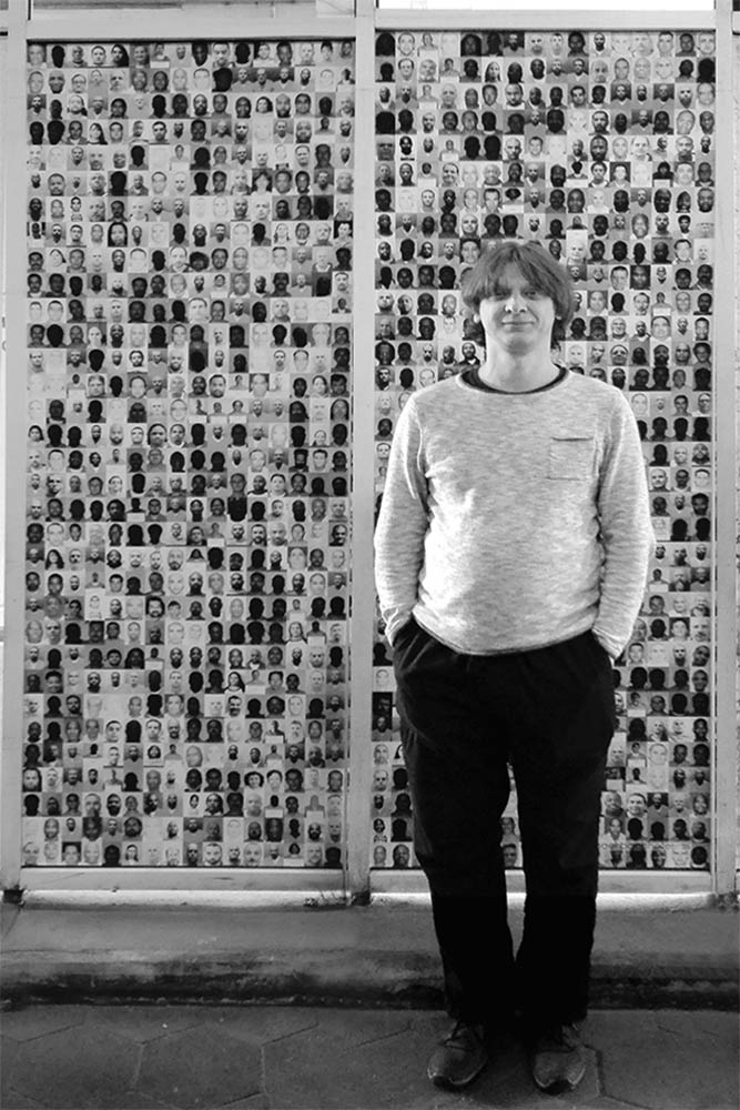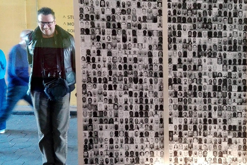 Short Description: One inmate's photo is replaced with a small TFT screen or within a projection of the entire collage. A pinhole camera discreetly captures photos of visitors standing in front of a uniformly illuminated background. The visitor’s head is automatically cropped. A second camera, linked to an analysis system, detects who will view the "Death Row Roster Image" next. The captured image of the visitor is then displayed on the shoulders of the replaced inmate's photo.