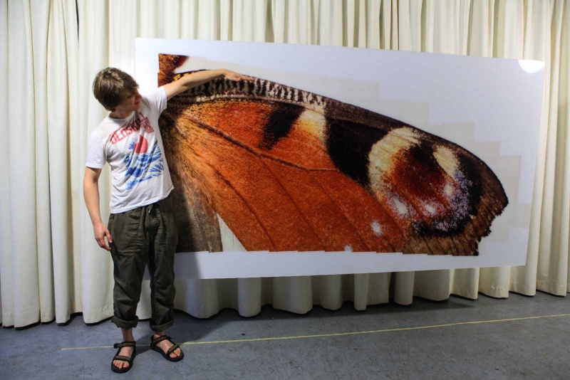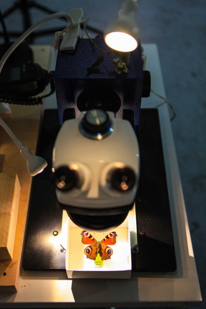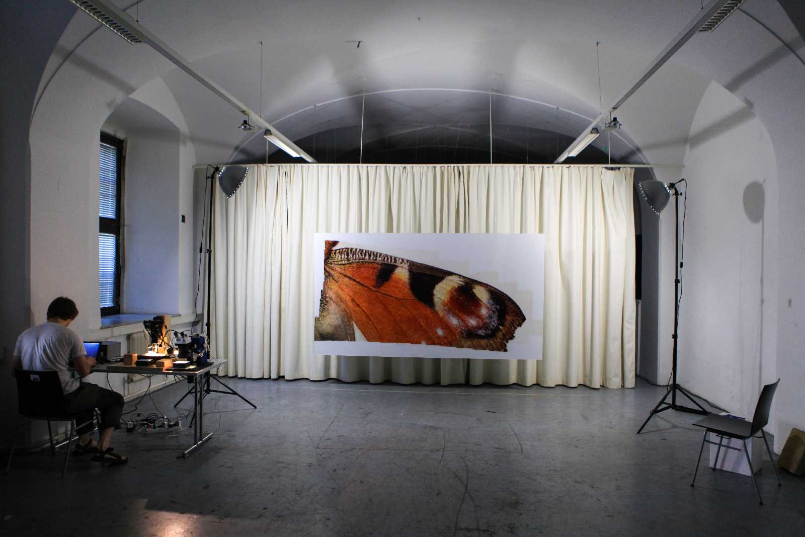 For this project, a device was developed to enable precise movement of the recording system (camera and microscope objective with a long working distance). The three stages can move in fractions of a micrometer and are computer-controlled. The resulting image has 1.5 gigapixels and can be printed at 3x6 meters with a resolution of 300 dpi, offering rich detail, such as pollen on the scales of a butterfly wing.